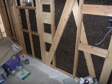 今無添加仕様の新築を施工中 お施主様のご要望でボンドと合板を使用しない完全無添加の住宅です。 屋根の下地は合板を使わずに杉板を使用。床も合板を使わず根太工法で無機質のケイカル板を使用しています。この工法は無添加住宅の独特の施工法です。断熱材は炭化コルクです。(壁に入っている黒いものです。)